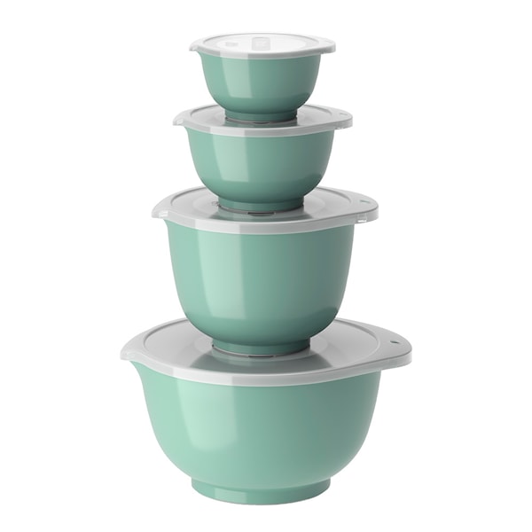 Set med Margrethe blandningsskålar i 4 av de vanligaste storlekarna. Setet innehåller 0,25 + 0,5 + 1,5 + 3 liter Margrethe-skålar med tillhörande lock.