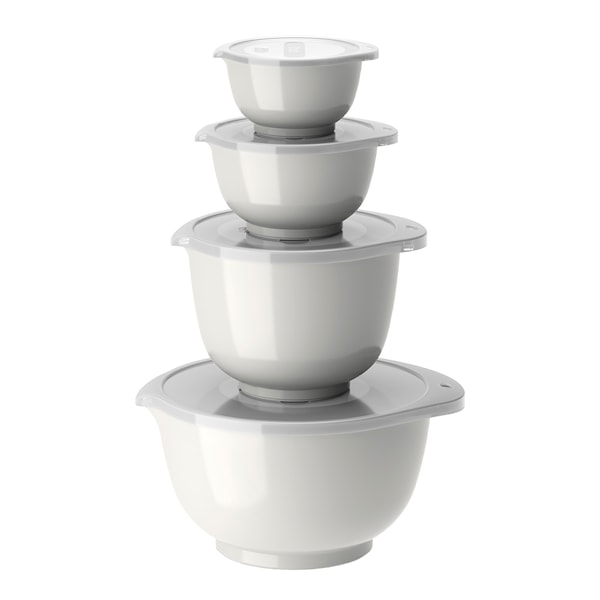 Set med Margrethe blandningsskålar i 4 av de vanligaste storlekarna. Setet innehåller 0,25 + 0,5 + 1,5 + 3 liter Margrethe-skålar med tillhörande lock.