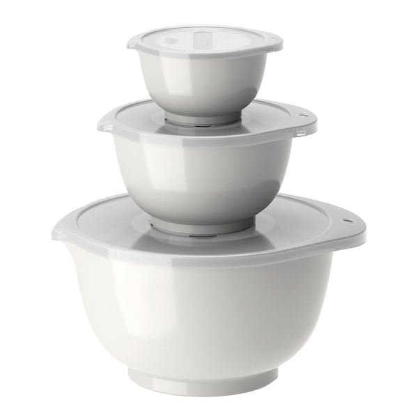 Set med Margrethe blandningsskålar i 3 av de vanligaste storlekarna. Setet innehåller 0,25 + 0,75 + 3 liter Margrethe-skålar med tillhörande lock.