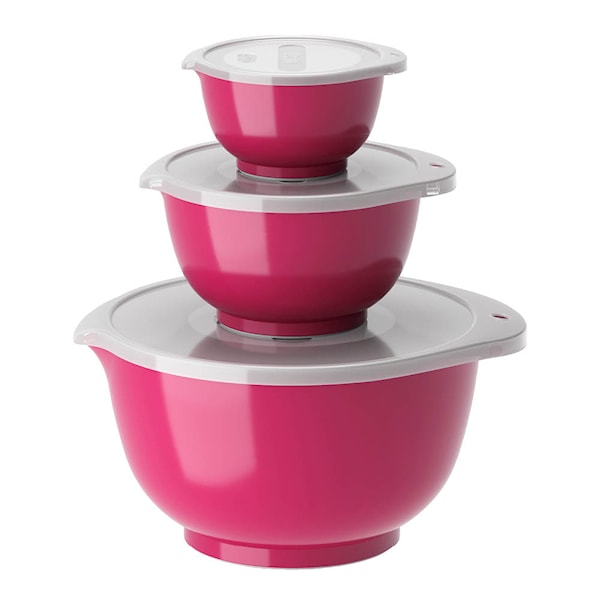Set med Margrethe blandningsskålar i 3 av de vanligaste storlekarna. Setet innehåller 0,25 + 0,75 + 3 liter Margrethe-skålar med tillhörande lock.