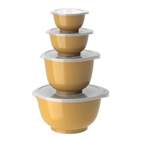 Set med Margrethe blandningsskålar i 4 av de vanligaste storlekarna. Setet innehåller 0,25 + 0,5 + 1,5 + 3 liter Margrethe-skålar med tillhörande lock.