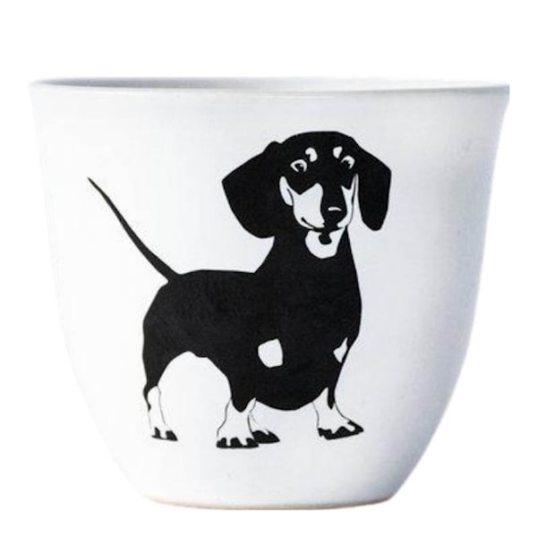 Tillverkad i stengods med blank vit glasyr och dekor med taxmotivet Åke