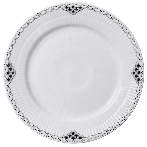 Black Lace assiett på 19 cm från Royal Copenhagen är den minsta tallriken i Black Lace-samlingen och en vacker detalj för varje dukning. Den vita porslinstallriken pryds av ett elegant svart mönster längs den räfflade kanten, vilket ger en sofistikerad och stilfull ram för söta desserter eller utsökta ostar.
