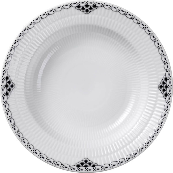 Black Lace djuptallrik på 21 cm från Royal Copenhagen är den perfekta tallriken för pastarätter och andra måltider som kräver en vacker presentation. Tallriken är tillverkad i porslin och pryds av ett elegant svart spetsmönster längs den räfflade kanten, vilket ger en sofistikerad och tidlös design.
