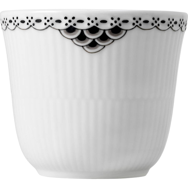 Denna 26 cl kopp från Royal Copenhagen ingår i Black Lace-serien och kombinerar klassisk design med en djärv modern twist. Med sin räfflade yta och handmålade spetskant får koppen ett uttryck av diskret elegans. Designen är inspirerad av Princess-kollektionen och Black Lace tar denna estetik till en ny nivå med sin monokroma look.