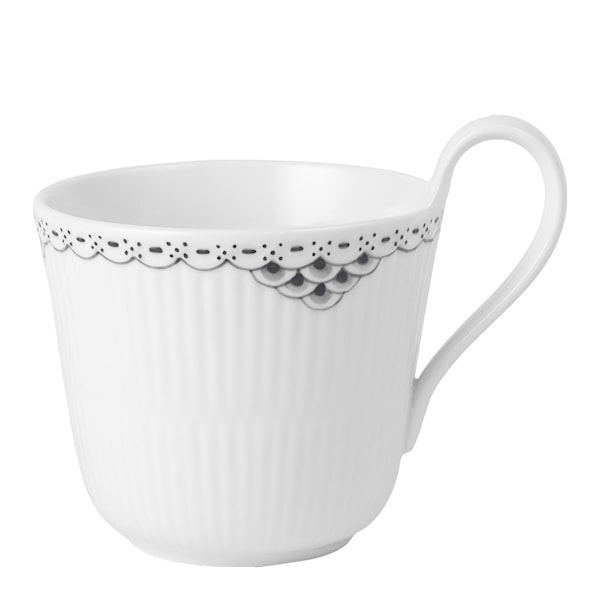 Black Lace mugg med högt handtag 33 cl från Royal Copenhagen. Denna ikoniska mugg är perfekt vid varje kaffe- eller te-stund. Den karakteristiska höga hänkeln gör inte bara muggen smidig att hålla i utan den ger också distinkt och stillfull charm. Den eleganta svarta spetsdekorationen lyfter den klassiska muggen.