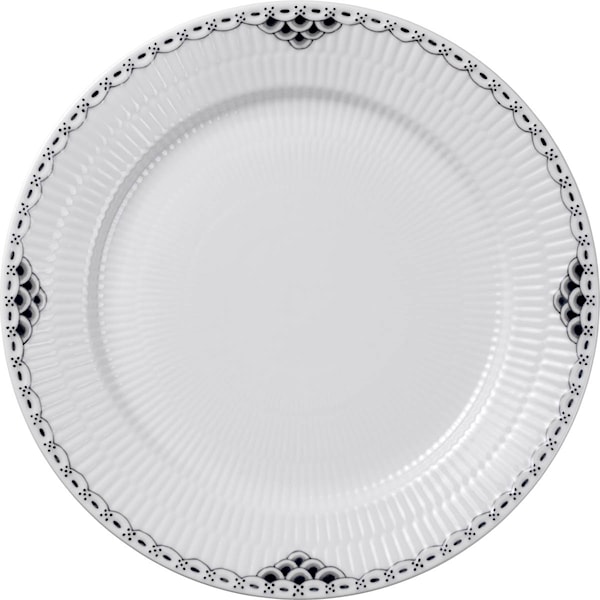Black Lace tallrik på 27 cm från Royal Copenhagen är den perfekta kombinationen av enkelhet och elegans. Med sin räfflade design och handmålade spetskant hämtar tallriken inspiration från den klassiska 1888 Half Lace-serien. Den vita flödade ytan kombineras med en diskret, men ändå djärv, svart spetsdetalj, vilket skapar ett intryck av både modern minimalism och tidlös skönhet.