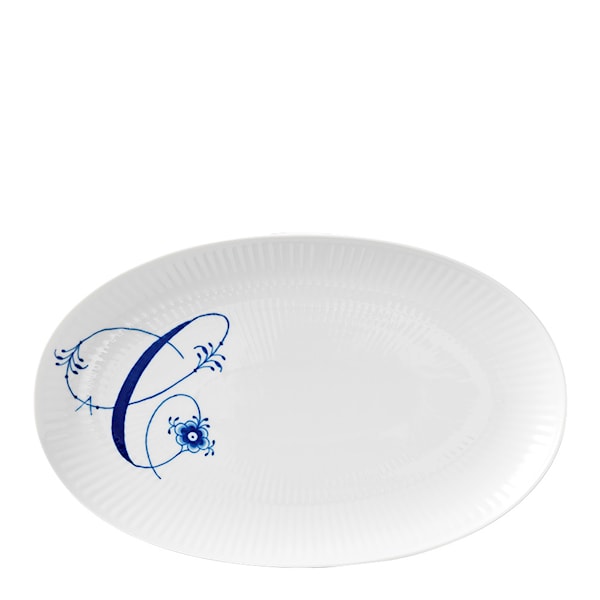Blue Fluted Pl Alphabet oval tallrik 23 cm från Royal Copenhagen, överraska någon du bryr dig om med en exklusiv ovala tallrik. Varje tallrik är unikt handmålad med en dekorativ bokstav, prydd med palmetter och en vacker krysantemum som ramar in bokstaven. Denna eleganta design gör tallriken till en perfekt personlig gåva och kan även användas som en liten serveringsbricka för små snacks eller tillbehör.