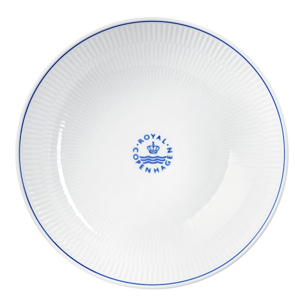 Royal Copenhagens serie Blueline har en sirligt handmålad, blå linje runt ovankanten och en handtryckt stämpel med Royal Copenhagens logga med kronan och vågorna, vilket framhäver den ikoniska räfflade ytan på ett mycket vackert sätt.
