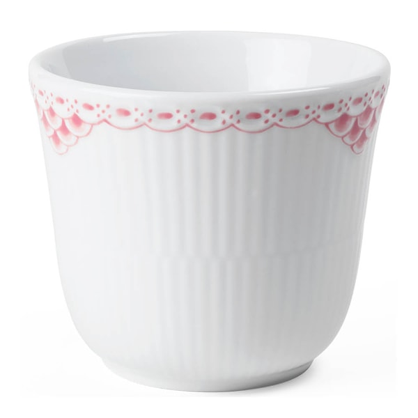 Tack vare den dubbla porslinskonstruktionen håller muggen drycken varm samtidigt som utsidan förblir behaglig att hålla i. Den vackra spetsliknande kanten i korallfärg ger en mjuk, dekorativ inramning som för tankarna till hantverksmässig spets och klassisk dansk formgivning.