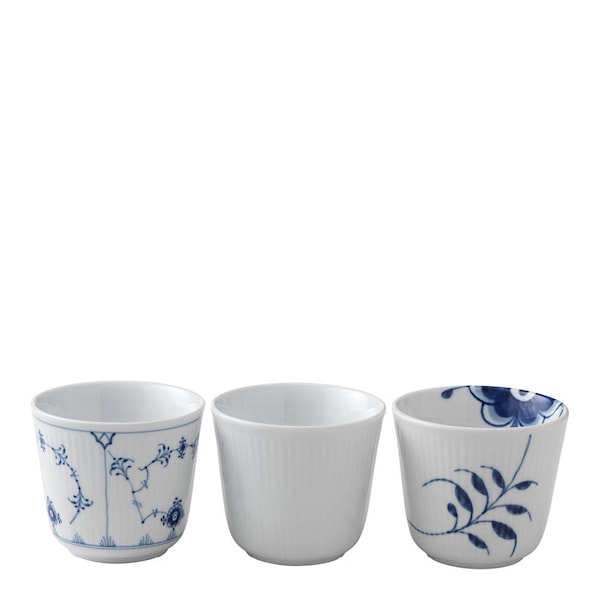 History Mix termomuggset från Royal Copenhagen innehåller tre termomuggar á 26 cl som representerar olika epoker i varumärkets designhistoria. Två är handmålade – Blue Fluted Mega och Blue Fluted Plain – och den tredje är White Fluted i sin rena enkelhet.