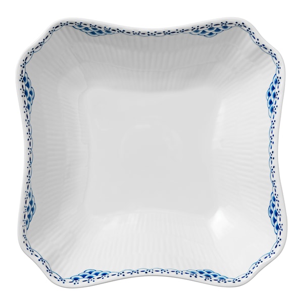 Kvadratisk skål med blå bård från Royal Copenhagens serie Princess. En fin uppläggningsskål som blir ett uppskattat inslag på bordet, fylld med en sallad eller andra goda tillbehör. Princess är en klassisk servis, både för middag och fika och kan gärna matchas tillsammans med andra kollektioner från Royal Copenhagen. Unna dig själv porslin som aldrig blir omodernt!