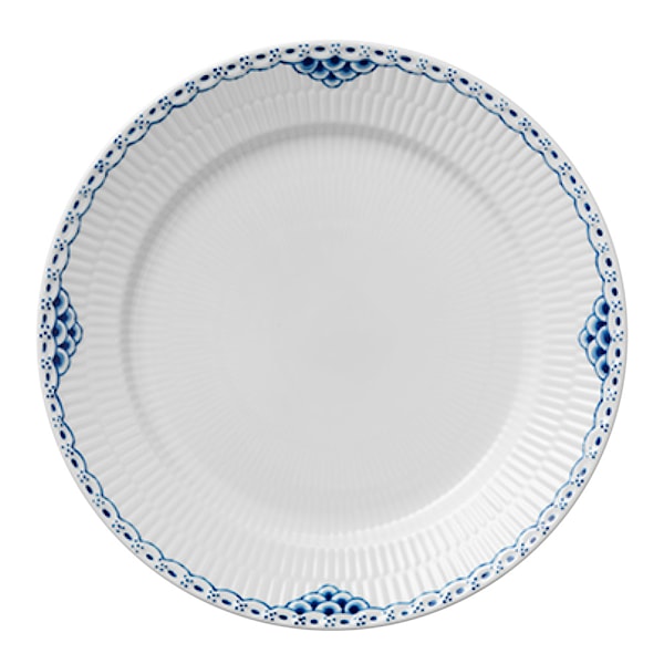 Royal Copenhagen Princess tallrik 27 cm är en del av en ikonisk porslinsserie som förenar danskt hantverk med stilren elegans. Den handmålade blå spetsdekoren och den räfflade ytan är kännetecken för Royal Copenhagens klassiska formspråk.