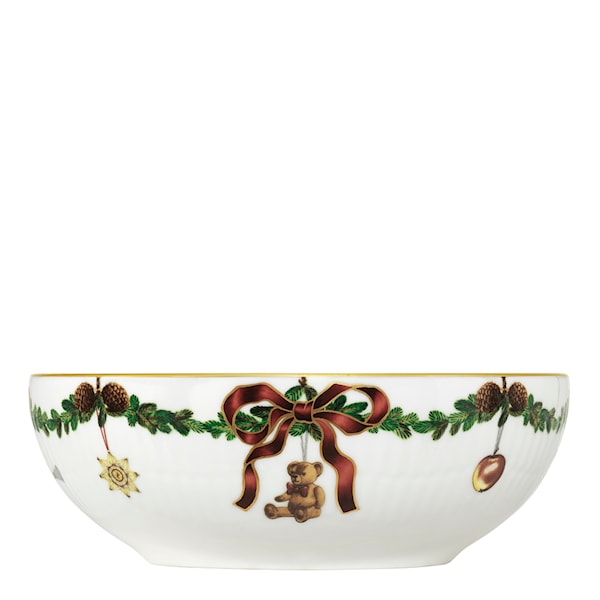 Serveringsskål för speciella stunder. Skålen är pyntat med kransar, rosetter och juldekorationer som förgyller dukningen. När bordet är dukat och ljusen tända är julen här!
