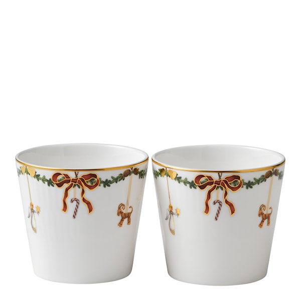 Två små koppar ur julserien Star Fluted Christmas från Royal Copenhagen. Fyll dem med god dryck, russin eller mandlar, eller använd dem som fina värmeljushållare.
