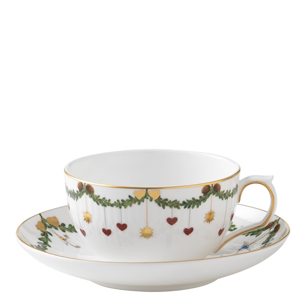 Ge julbordet en klassisk och stämningsfull prägel med Star Fluted Christmas tekopp 32 cl med fat från Royal Copenhagen. Det förstklassiga benporslinet är dekorerat med sirligt målade grankransar som pryds av hjärtan, klockor, stjärnor och små kottar. En elegant hög hank med gyllene kant och ett matchande fat med gulddekor fulländar helheten, vilket gör koppen till ett vackert inslag under alla julens te- och kaffestunder.