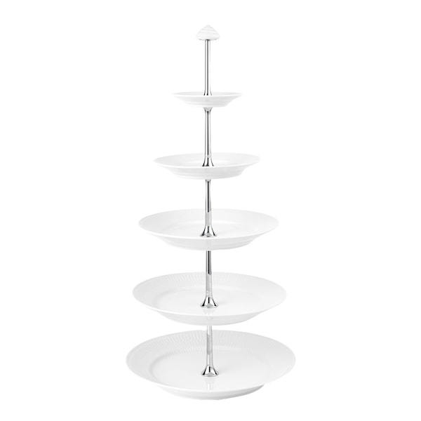 White Fluted Étagère med 5 våningar är en skönhet som har hämtats från Royal Copenhagens arkiv. Fullända ett vackert dukat dessertbord med en helt unik serveringsdel.
