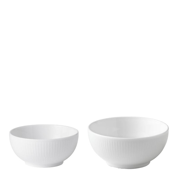 White Fluted skålset från Royal Copenhagen består av två eleganta skålar – 24 cl och 47 cl – och är ett stilrent tillskott i det dukade hemmet. Med sin räfflade struktur och tidlösa design passar setet lika bra till frukost som till festmåltider.