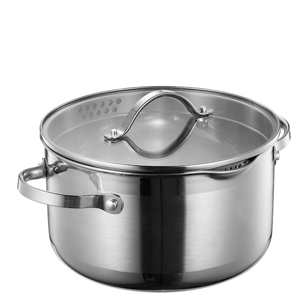 Grytan är utrustad med en praktisk hällpip och ett lock med integrerad sil som gör det enkelt att hälla av vatten direkt från grytan utan extra redskap. Konstruktionen gör att alla typer av köksredskap kan användas, även stålredskap. Den 3-skiktade impact-botten på 2,6 mm har en aluminiumkärna som sprider värmen snabbt och jämnt, medan ytterlagren i 18/8 och 18/0 rostfritt stål bidrar till stabilitet och lång hållbarhet.