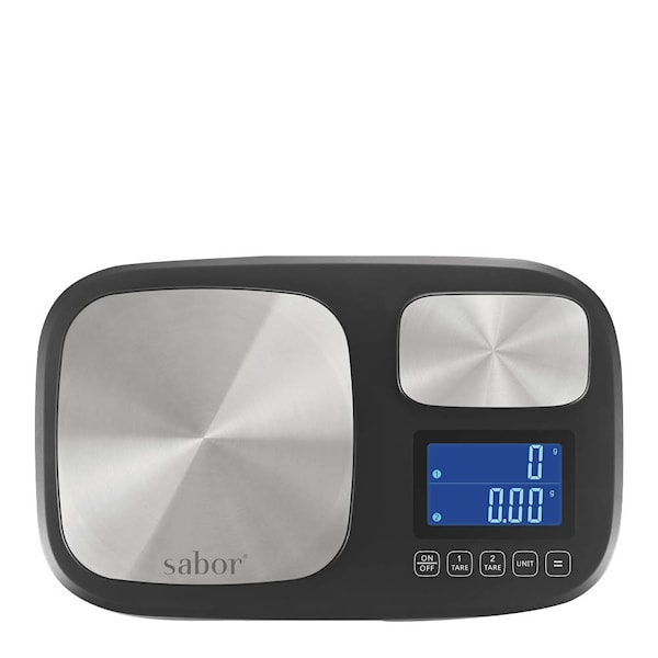 Sabor Ultimate köksvåg med dubbla vågzoner gör det enkelt att mäta både små och stora mängder med hög precision. Den stora vågplattan klarar upp till 10 kg och har en noggrannhet på 1 g. Den mindre zonen väger från 0,2 g upp till 1 kg – perfekt när du behöver exakt mängd espressobönor, jäst eller kryddor. Välj mellan flera olika enheter: gram, kilo, pund, uns, milliliter samt lb:oz.