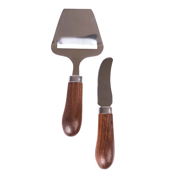 Osthyvel och smörkniv ur Sagaforms serie Astrid med vackert chokladbrunt wengeträ och rostfritt stål.