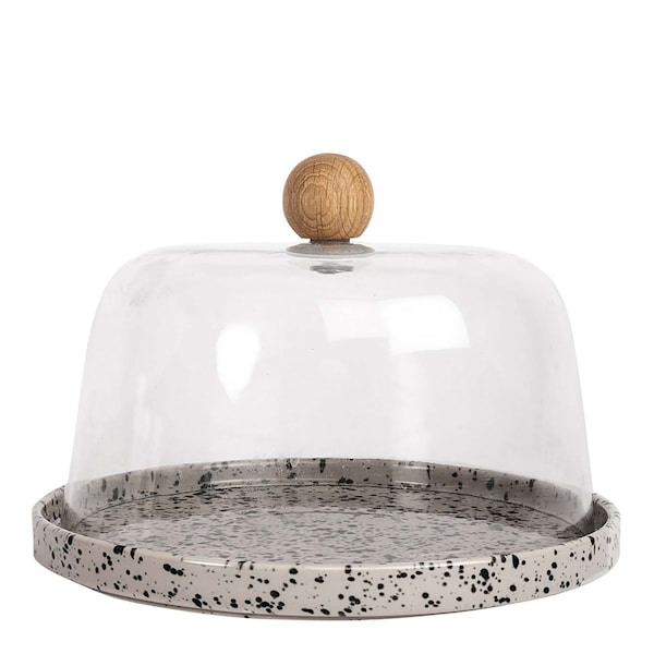 Själva plattan är tillverkad av stengods i samma härliga färgsättning som övriga serien med sitt karaktäristiska svarta stänkmönster. Locket eller kupan är gjord i akrylplast med en knopp av trä.