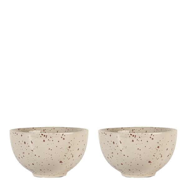 Sagaforms Ditte-skålar i 12 cm, här i 2-pack, är ett elegant och funktionellt tillskott till det dukade bordet. Den beige färgtonen tillsammans med det vinröda stänkmönstret skapar ett organiskt uttryck som passar i både klassiska och moderna hem. Varje skål är tillverkad för hand i stengods, vilket gör varje exemplar helt unikt.