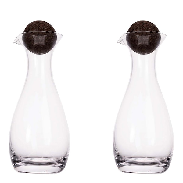 Tillverkade i munblåst borosilikatglas med lock i mörkbrun kork och samma stilrena look som övriga serein. Materialet kork är helt ogenomtränglig för vätska så flaskorna är perfekta att ha till olja och vinäger, som mjölkkanna, en liten vinkaraff eller till din hemmagjorda dressing. Flaskorna säljs i 2-pack.