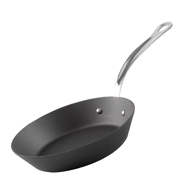 Pannan är tillverkad i kolstål – ett material som förenar gjutjärnets styrka med rostfritt ståls lätthet. Med tiden utvecklar den en naturlig patina som fungerar som en non-stick-yta utan kemisk beläggning. Den tål alla värmekällor, inklusive öppen låga och ugn (även vid höga temperaturer), och fungerar utmärkt på induktion.