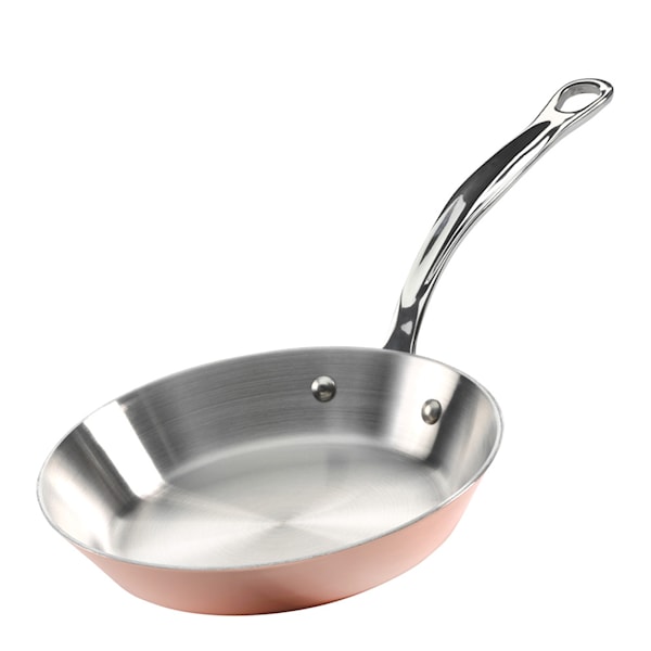 Den blankpolerade kopparytan ger ett raffinerat uttryck, medan det rostfria handtaget håller sig svalt under användning. Pannan ger en krispig och jämn stekyta och är ett utmärkt komplement till non-stick. Den passar lika bra på spisen som på matbordet. Handdisk rekommenderas för att bevara finishen. Tillverkad i Storbritannien.