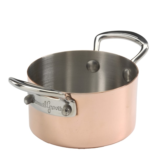 Serveware minigryta 9 cm från Samuel Groves är en liten och dekorativ gryta i rostfritt stål med en elegant kopparbelagd utsida. Med en kapacitet på 0,25 liter är den perfekt för servering av små rätter, såser, tapas eller individuella portioner. Den nätta storleken gör grytan idealisk för att skapa en exklusiv och genomtänkt serveringsupplevelse.
