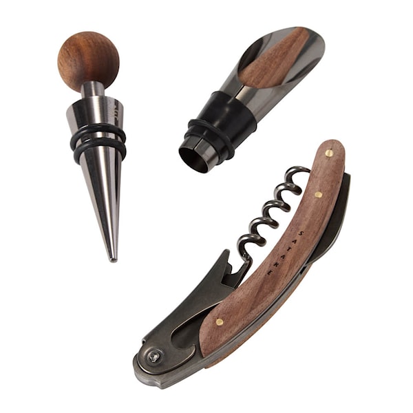 Satake vinset i akaciaträ med tre specialiserade tillbehör är framtaget för strukturerad hantering av vin från öppning till servering och förslutning. Kombinationen av trä och rostfritt stål ger både hållbarhet och ett enhetligt uttryck.