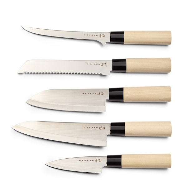 Handtagen är tillverkade av magnoliaträ, vilket ger ett naturligt och bra grepp samtidigt som det ger knivarna ett tidlöst och elegant uttryck. Setet levereras i en vacker balsalåda, vilket gör det till en perfekt gåva eller ett elegant sätt att förvara dina knivar.