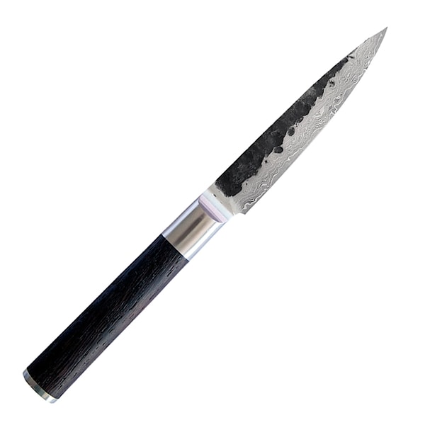 Kuro Petty 11 cm från Satake är en mindre smidig skalkniv. Handsmidd och tillverkad av 67 lager damascusstål levereras den i en vacker trälåda. Serien Kuro är framtagen för balans och precision. Resultatet är en grovt hamrad kniv med ett blad av VG-10-stål som är processat åtta gånger vilket ger extra skärpa och en hårdhet på ca 58 HRC. Det långa handtaget av bränt trä med bolster och skaftände av 18/8-stål ger perfekt grepp, balans och stabilitet.