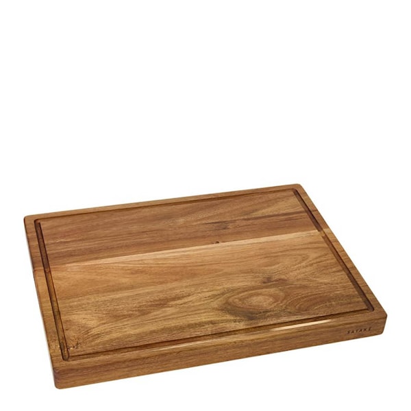 Satake skärbräda i akaciaträ, 38x50 cm, kombinerar stil, funktion och hållbarhet. Ena sidan har en praktisk ränna för vätska, den andra är slät. Brädan är tillverkad i massivt trä, behandlad med skyddande olja och klar att använda direkt.