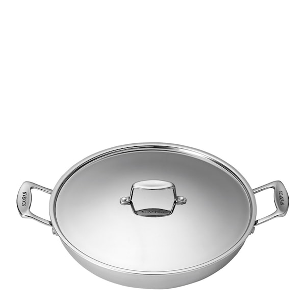 Scanpan Fusion 5 serveringspanna med lock 32 cm är en generös och mångsidig panna för matlagning som kräver extra utrymme. De höga kanterna gör den idealisk för att bryna kött, ugnsgratinera eller tillaga såsbaserade rätter som behöver längre tid på spisen. Det medföljande locket i rostfritt stål och den högglansiga designen gör pannan lika vacker att ställa direkt på matbordet som att använda på spisen.