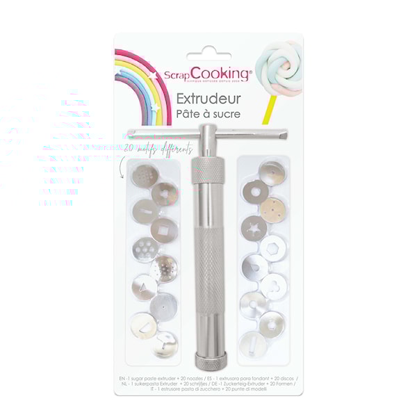 Med fondantpressen från ScrapCooking blir det lekande lätt att forma sockerpasta till dekorativa detaljer. Denna robusta extruder i aluminium är 17 cm lång och levereras med hela 20 olika skivor, så att du enkelt kan skapa allt från bårder och band till hårstrån och mönster i olika stilar.