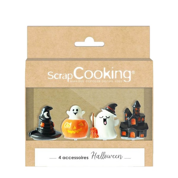 Skapa en stämningsfull Halloween med detta dekorset från ScrapCooking. Setet innehåller fyra olika kakdekorationer: en liten trollkarlshatt, ett klassiskt spöke, ett herrgårdshus med spöklik känsla och en pumpa med häxtema – perfekt för att lyfta både kakor och desserter till rätt Halloweenstämning.