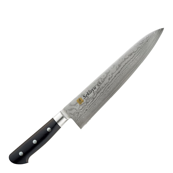 Damask kockkniv från Sekiryu är en mångsidig kniv med ett blad på 21 cm, perfekt för att skära, hacka och skiva kött, fågel, grönsaker och rotfrukter. Det breda bladet med en lätt böj längs eggen gör kniven idealisk för precisionsarbete i köket. Detta är en pålitlig kniv för de flesta uppgifter i matlagningen.
