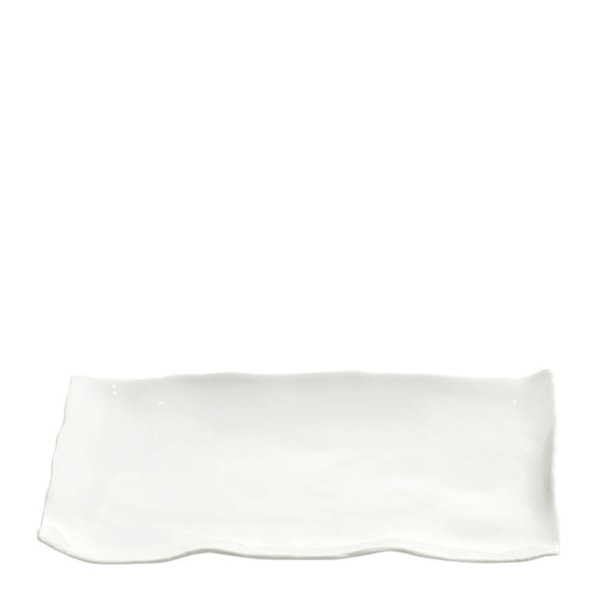 Denna rektangulära tallrik i benporslin mäter 30x15 cm och lämpar sig perfekt för allt från förrätter och tapas till uppläggning av dessert eller små tillbehör. Den vita glasyren och den mjukt asymmetriska formen skapar en poetisk känsla som ger dukningen ett personligt och stilfullt uttryck.