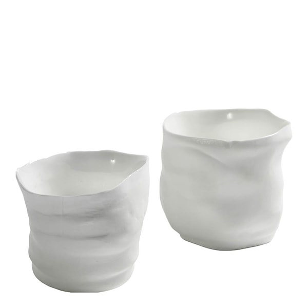Dessa unika espressokoppar är tillverkade i högkvalitativt benporslin och rymmer 10 cl. Med sin rena vita glasyr och mjukt asymmetriska form är de perfekta för espresso eller små, värmande drycker. En stilfull detalj som både känns tidlös och unik, och som ger kaffestunden en elegant och konstnärlig inramning.