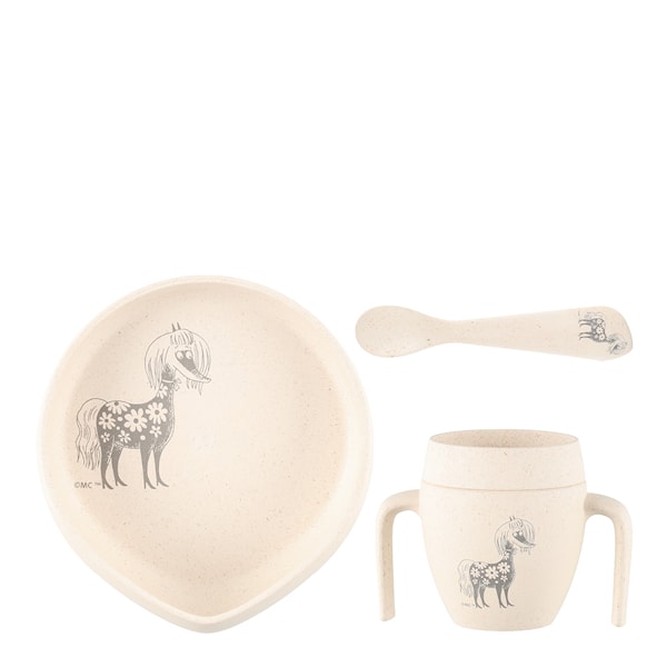 Skandino Mumin barnservis är skapad med fokus på ergonomi och funktion. Den är tillverkad i Finland och har tagits fram i samarbete med logopeder och arbetsterapeuter för att stödja barnets naturliga utveckling av att äta och dricka självständigt.
