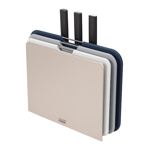 Elegant set med 3 skärbrädor och 3 knivar. Joseph Joseph grundades 2003 av tvillingarna Richard och Antony Joseph. Deras expertis ligger i moderna köksverktyg, med målet att förenkla vardagen i köket. De har fått internationell erkänsla för sina tekniskt innovativa köksprodukter, med fokus på smart design. Företaget har utsetts till årtiondets mest trendiga leverantör av köksutrustning.