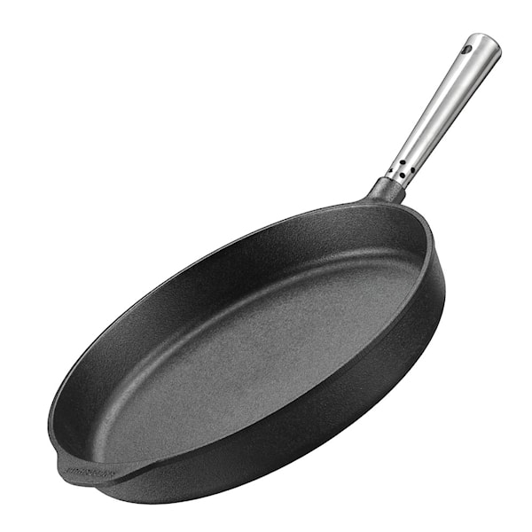 Professional Traktörpannan på 30 cm med Stålhandtag från Skeppshult är tillverkad av gjutjärn, stål och inbränd olja. Denna panna erbjuder en naturlig, enkel och robust användning på alla värmekällor. Med en naturlig non-stick yta, som förbättras med varje användning, är alla våra stekkärl designade för att hålla i flera generationer. Det är ett enkelt men krävande hantverk, där varje detalj gjuts i en unik sandform som sedan bryts upp, vilket gör varje Skeppshultprodukt unik och distinkt. Detta är stolt hantverk från vårt gjuteri i de småländska skogarna.