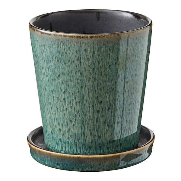 Danske Christian Bitz har designat denna eleganta ytterkruka och tillhörande fat. Gjorda i stengods med läckert färgad glasyr på utsidan och en praktiskt matt, svart glasyr på insidan. Krukan Skjuler