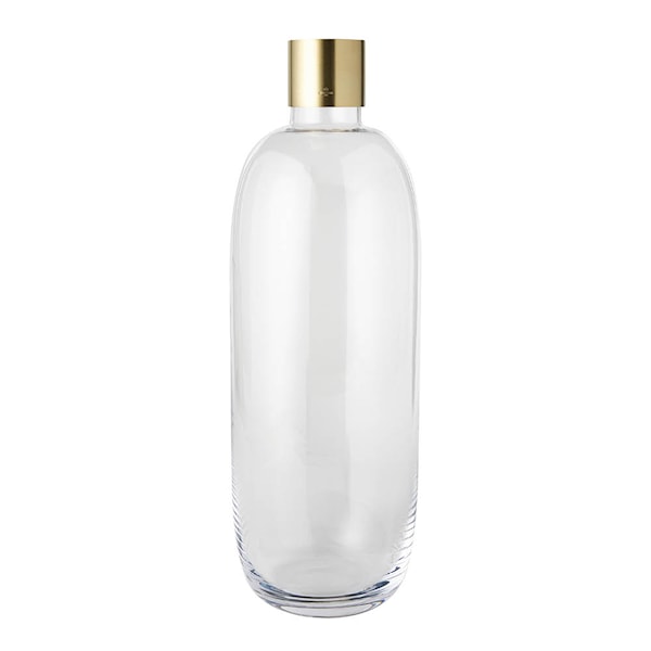 Skultunas stora Damejeanne-vas i glas med topp i mässing är resultatet av samarbetet med formgivaren Emma Olbers. Designen är inspirerad av historiska damejeanner, där glasbehållaren ofta skyddades av en korg.