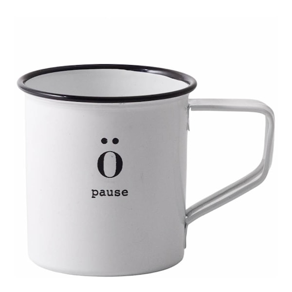 Sögne Emaljmugg mini 12 cl Pause är en stilren liten kopp i vit emalj, med texten “Pause” som påminner om att ta det lugnt. Med sin mjuka drickkant och handgjorda finish blir den snabbt en favorit – för espresso, te eller utflykter.
