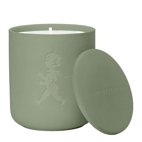 Solstickan doftljus 9×7,5 cm i grön keramik sprider en elegant doft av ebenholts och smälter in i hemmets miljö med sin sobra design.