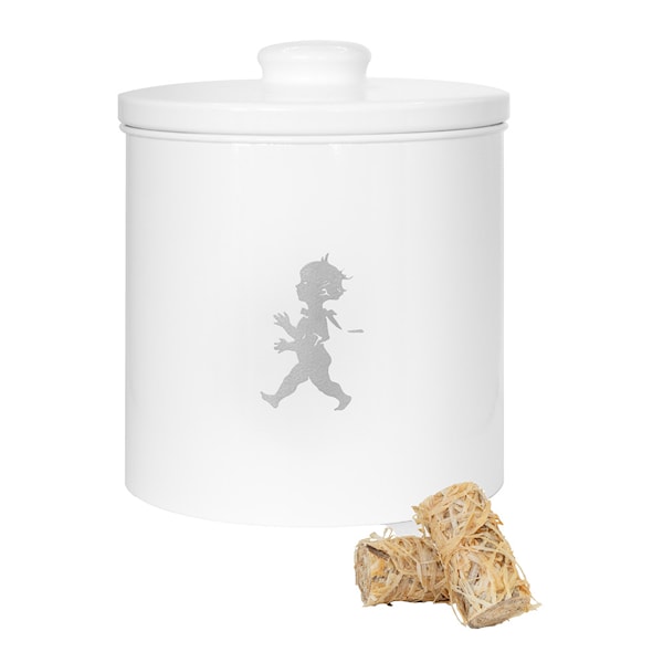 Denna runda förvaringsburk från Solstickan, med en stilren vit design, är både praktisk och estetisk, perfekt för att hålla dina braständare nära till hands under vintern. Burken är prydd med den klassiska Solstickepojken på framsidan, vilket gör den till en snygg och nostalgisk inredningsdetalj för alla som uppskattar stunder vid grillen eller mysiga kvällar framför öppna spisen eller kaminen.