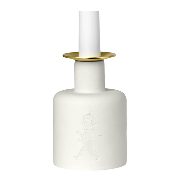 Solstickan ljusstake i keramik 10×7 cm kombinerar enkel design med smart funktion. Ljusmanschetten i guld förhöjer uttrycket samtidigt som den skyddar mot stearinstänk.